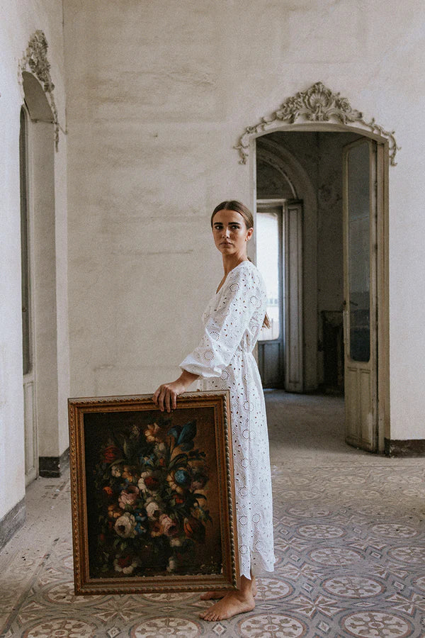 Su largo midi y su tejido de algodón lo convierten en una opción perfecta para disfrutar de momentos de descanso con estilo, combinando comodidad, frescura y un diseño atemporal.