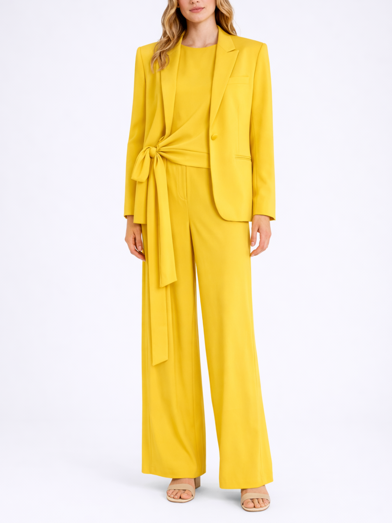La chaqueta entallada con solapas de pico completa el conjunto aportando estructura y equilibrio al look. Los bolsillos de ribete en la parte delantera y en el pecho, junto con el cierre frontal con botón, refuerzan su estética elegante y atemporal. Las mangas largas con puños abotonados añaden un acabado pulido y sofisticado que eleva el conjunto.