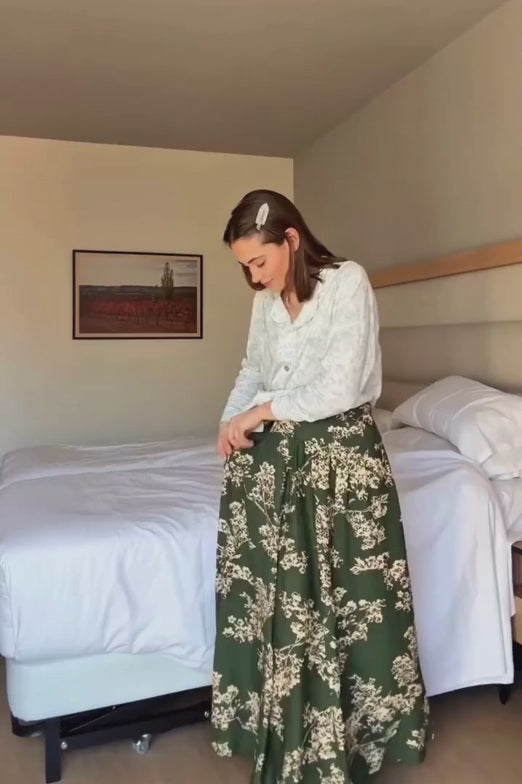 La falda completa el conjunto con una silueta fluida y favorecedora. Diseñada con cintura ancha que define la figura y un amplio vuelo en la parte inferior, aporta movimiento y elegancia al caminar. Cuenta con cremallera lateral para un ajuste cómodo y discreto y está completamente forrada, garantizando una caída impecable y un acabado de gran calidad.