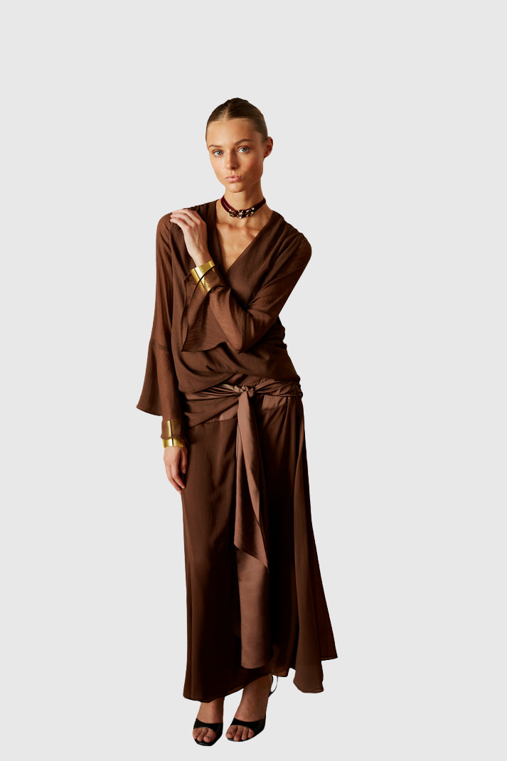 El Conjunto Bergen es una propuesta elegante y femenina que destaca por su silueta favorecedora y su estilo sofisticado. Confeccionado en un tejido ligero con caída suave en tono chocolate, crea un conjunto armonioso y estilizado, ideal para invitadas que buscan un look especial, cómodo y fácil de reutilizar en distintas ocasiones.