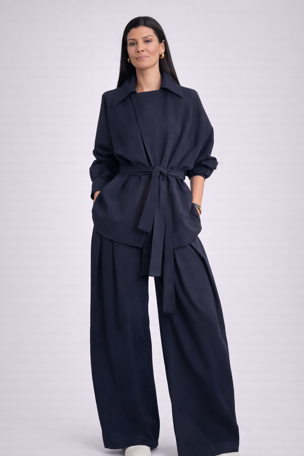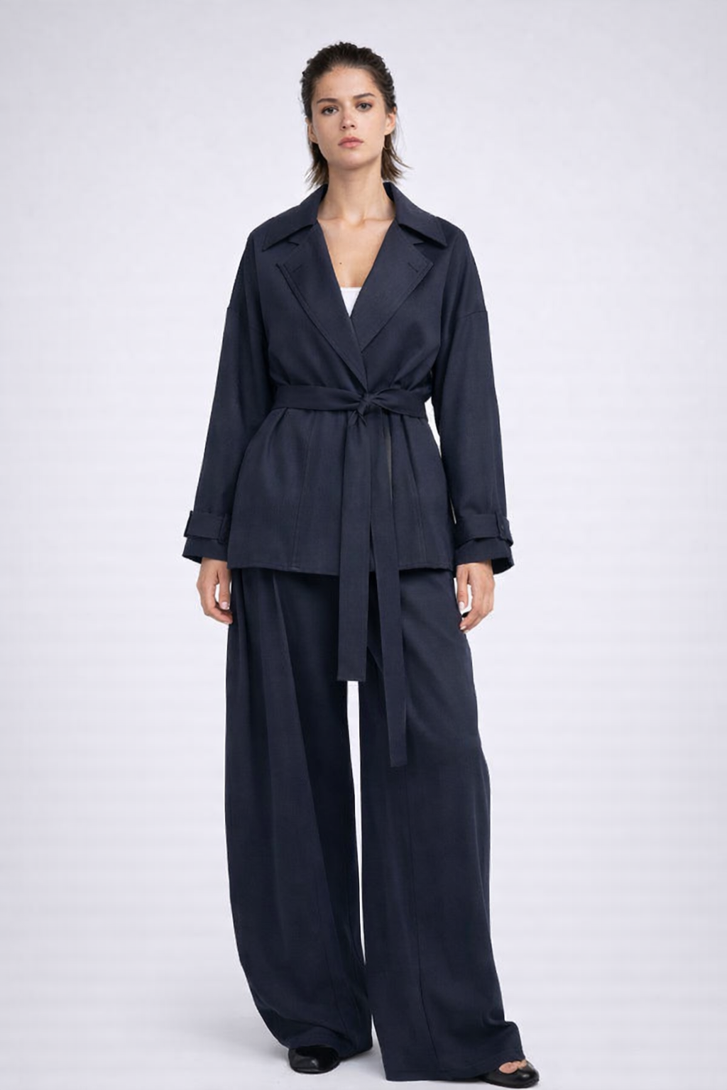 El trench corto, confeccionado en un tejido ligero y de caída suave, presenta un diseño fluido con cuello de solapa que aporta un aire elegante y atemporal. Las mangas largas terminadas en trabilla añaden un detalle sutil de sastrería, mientras que los bolsillos delanteros aportan funcionalidad al diseño. El cinturón lazada en el mismo tejido permite ajustar la prenda a la cintura, definiendo la silueta de manera natural. El cierre frontal con botón completa la pieza con un acabado limpio y sofisticado.