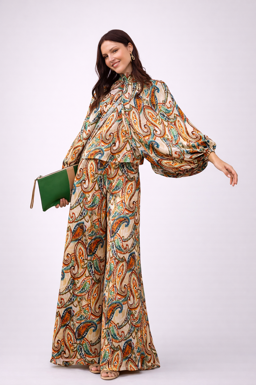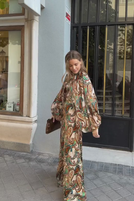 El pantalón, con corte palazzo de pierna ancha, complementa el conjunto con una caída fluida que aporta movimiento y estiliza la silueta. Su estampado paisley en tonos naranjas, verdes y azules sobre una base crema mantiene la armonía visual del conjunto, creando una estética sofisticada, alegre y llena de dinamismo.