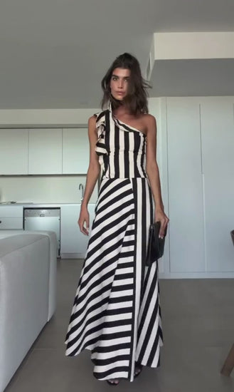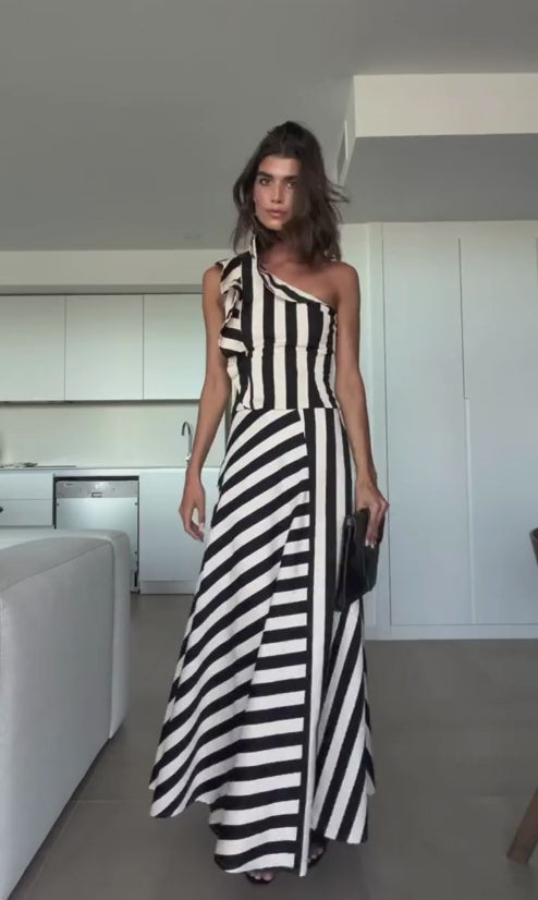 El top, de diseño asimétrico a un solo hombro, destaca por su elegante volante estructurado que aporta volumen y personalidad a la pieza. Su corte entallado define la cintura y estiliza la silueta, mientras el patrón de rayas refuerza el carácter moderno del conjunto.
