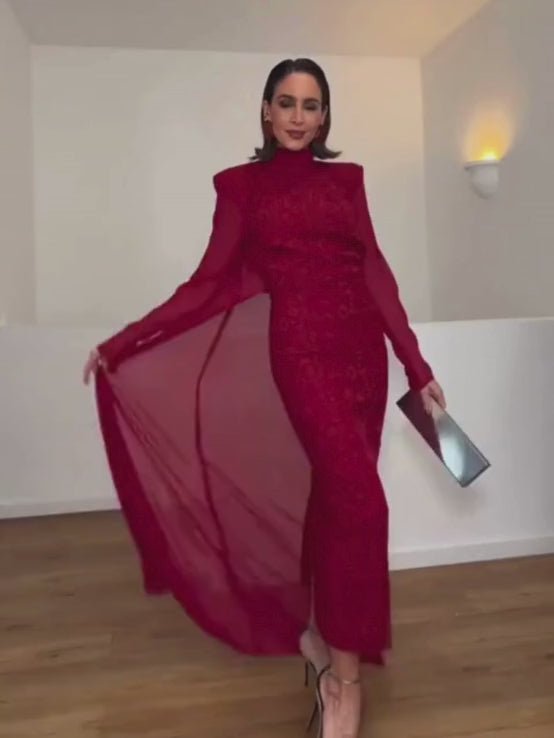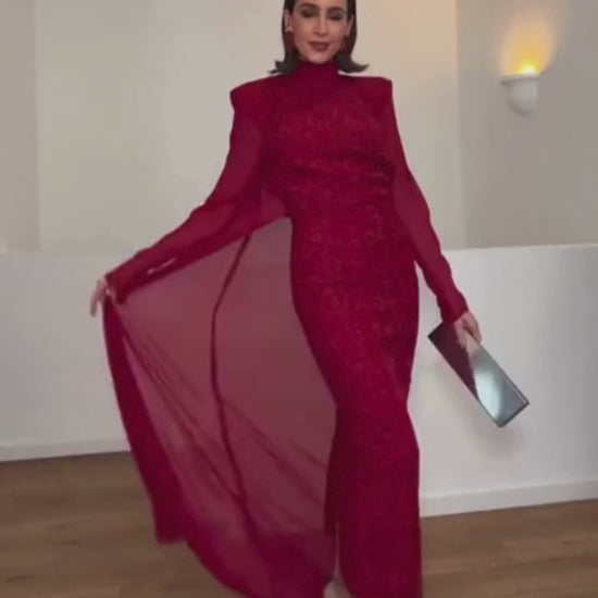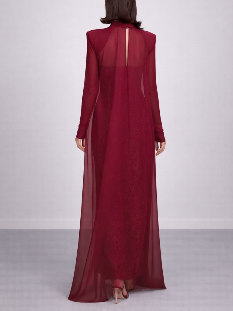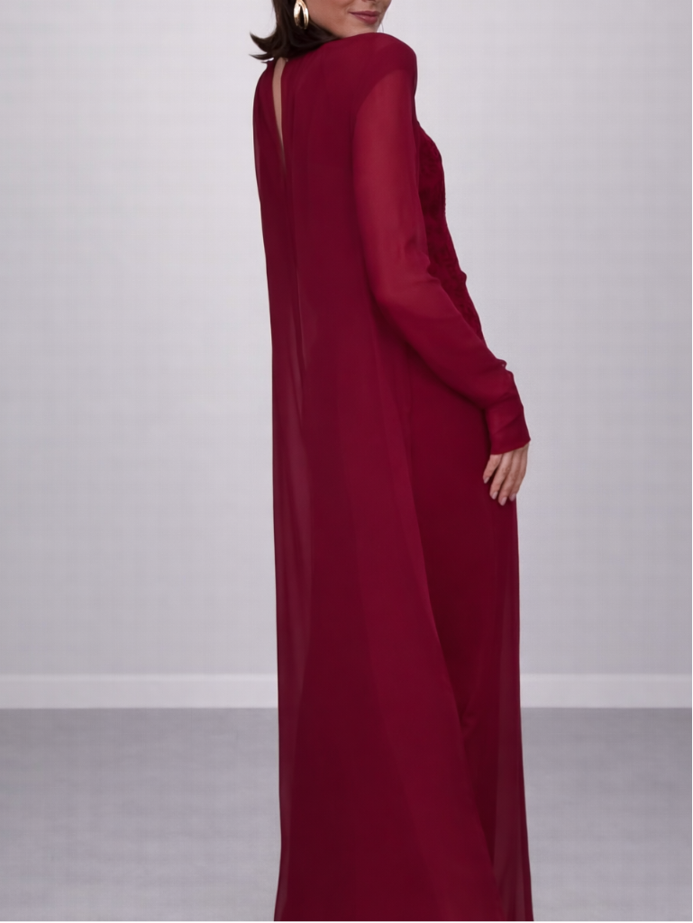 El Conjunto Moscú es la máxima expresión de elegancia estructurada y sofisticación atemporal. Un diseño imponente en tono burdeos profundo que destaca por su tejido con relieve y su delicada capa translúcida, creando un equilibrio perfecto entre fuerza y feminidad.