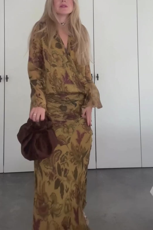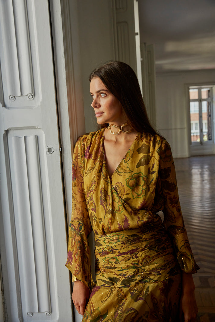 La blusa presenta un diseño fluido que aporta movimiento y ligereza al conjunto. Su corte favorecedor y su tejido ligero permiten llevarla con comodidad durante todo el evento, aportando un aire elegante y relajado al estilismo.