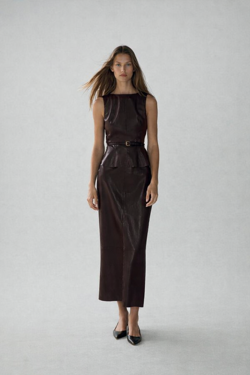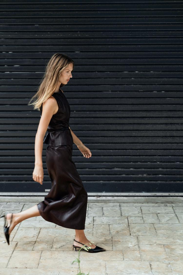 El top presenta un diseño de cuello redondo y manga sisa que aporta una silueta limpia y elegante. El detalle de cinturón fino define la cintura y realza la forma del cuerpo, mientras que el bajo en evasé introduce un ligero volumen que aporta movimiento y sofisticación. El cierre en la espalda con cremallera oculta en la costura mantiene una apariencia pulida y discreta.