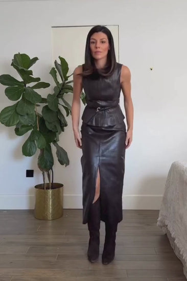 La falda de tiro alto complementa el conjunto con una silueta estilizada y elegante. Su diseño estructurado se ajusta suavemente a la figura, mientras que la abertura en la parte posterior del bajo aporta comodidad y libertad de movimiento. El cierre lateral con cremallera oculta en la costura mantiene una estética limpia y refinada.