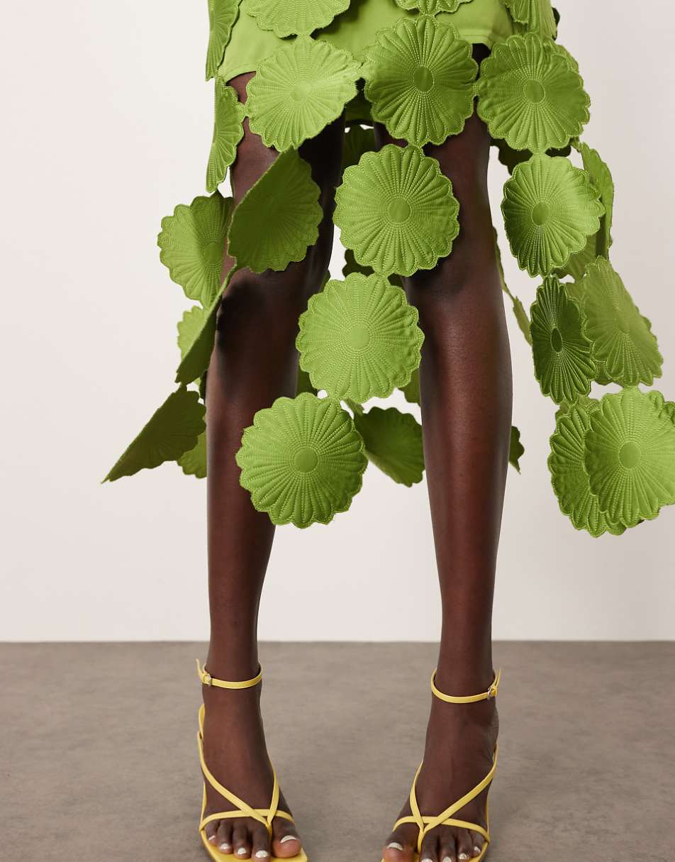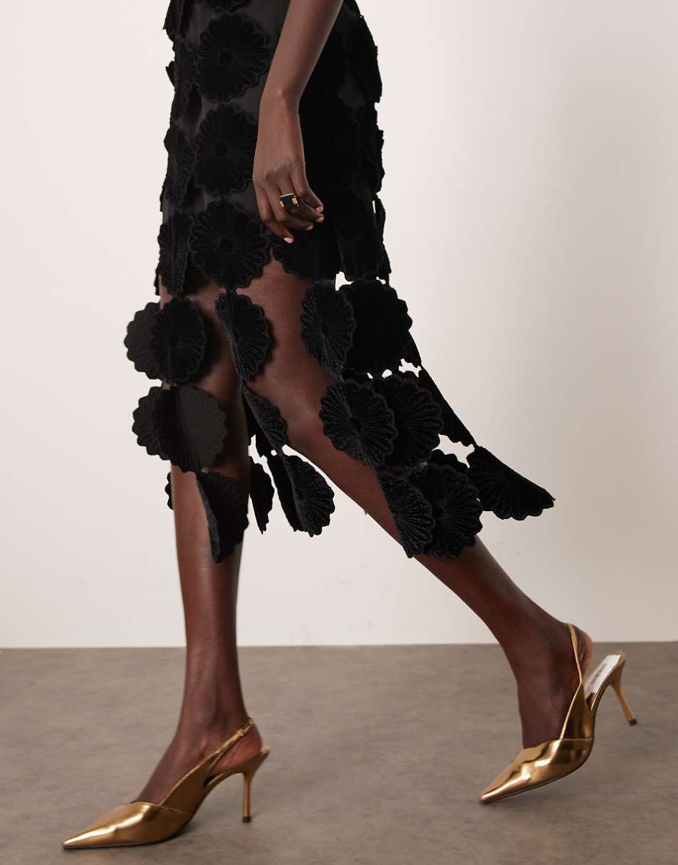 El escote recto con tirantes finos aporta ligereza y realza la parte superior con sutileza, creando una línea limpia y elegante. El diseño floral calado se convierte en el protagonista, aportando profundidad visual y un juego de transparencias que eleva la pieza con un carácter único. El bajo de flecos añade movimiento y dinamismo, generando un efecto fluido y sofisticado al caminar.